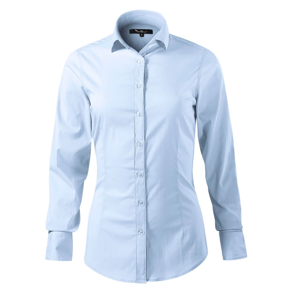 263 Dynamic női ing Női ing enyhén szűkített szabással és oldalvarrással. A hátsó rész kettős hajtással a mellrész és derék szűkítővarrással készült. Dupla ing gallér. Az elülső rész gombolópánttal végződik, hosszú ujjú szögletes mandzsettával és 2 gombbal. Gyöngyház gombok a szövet színében (plusz 1 tartalék gombbal). Formázott alsó szél.