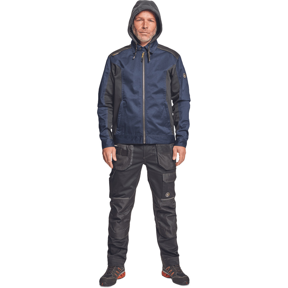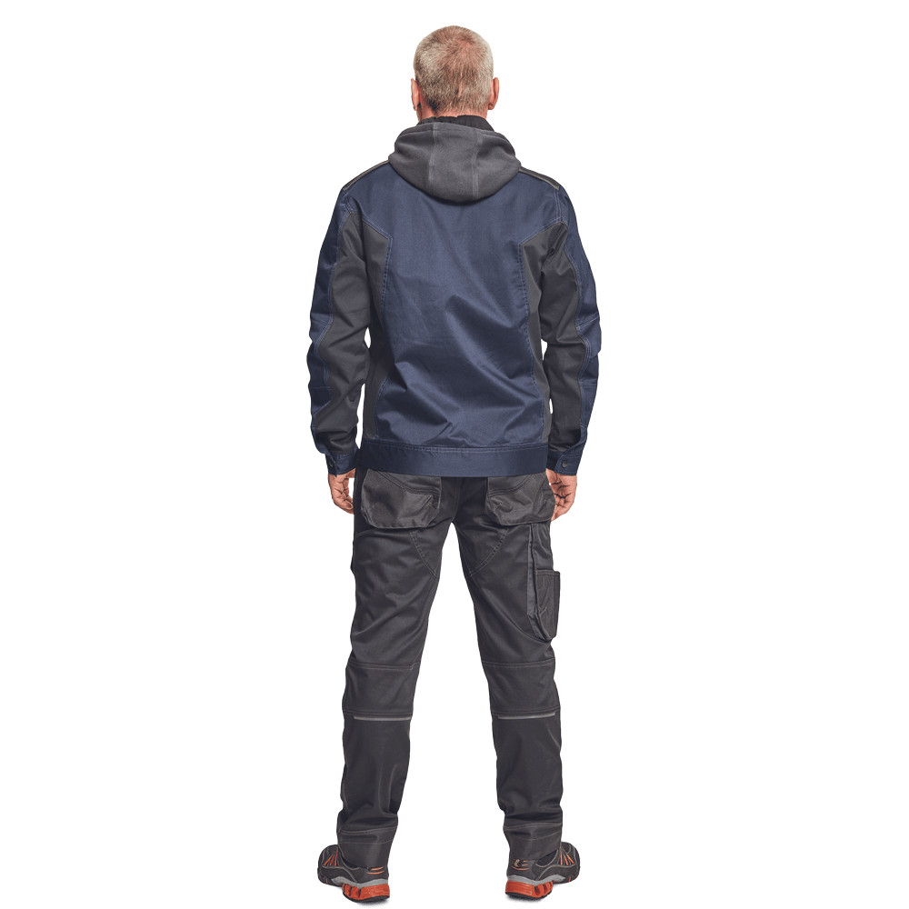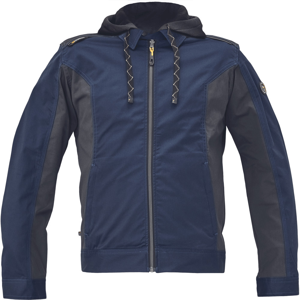 Dinamikus vonalvezetésű, ergonomikus szabású munkavédelmi kabát, levehető kapucnival, tartós, kényelmes, rugalmas anyagból.