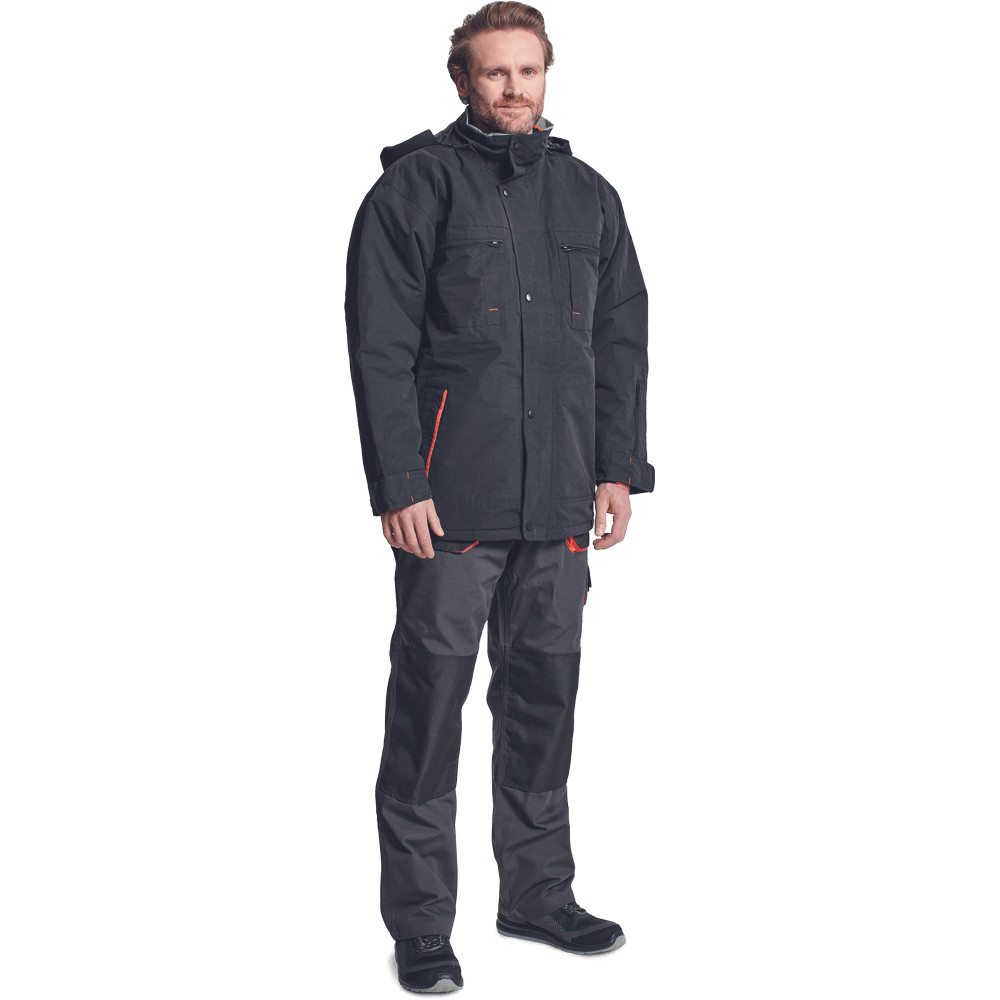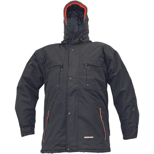 Vízálló anyagú, bővített szabású, levehető kapucnival rendelkező melegen bélelt, téli munkáskabát, praktikus, cipzáras zsebekkel.