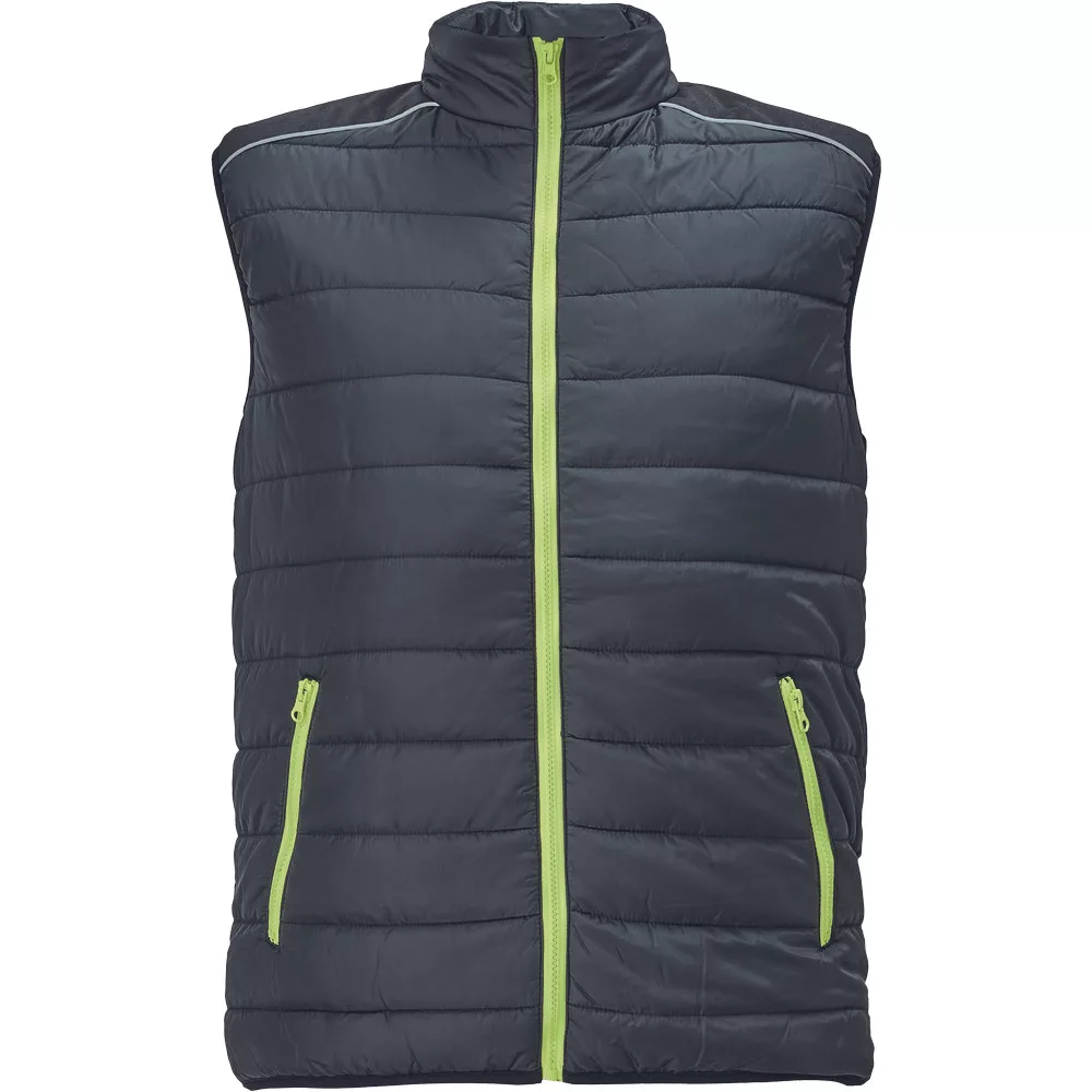 Víztaszító, szélálló, könnyű anyagú kényelmes végigcipzáras munkás mellény.