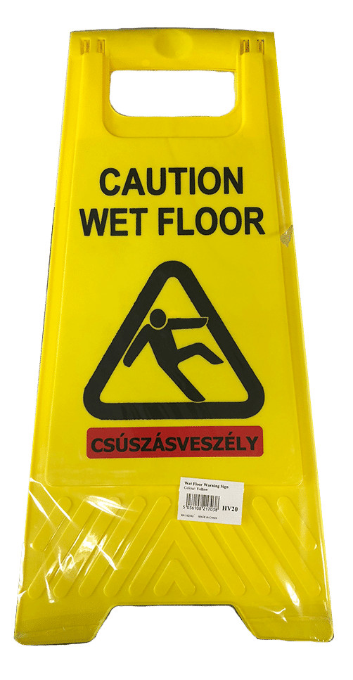 Csúszásveszély figyelmeztető tábla. Mindkét oldalon feliratozással, nedves padló szimbólummal. A csomag tartalmazza a magyar nyelvű feliratozást is!