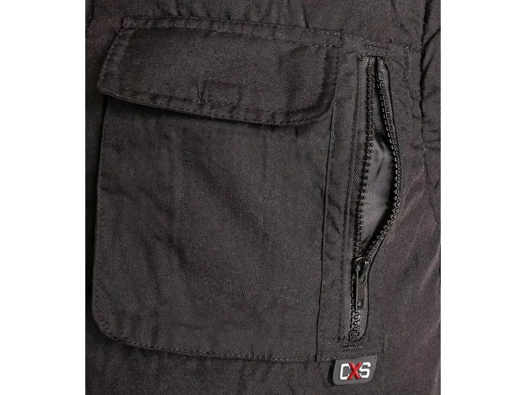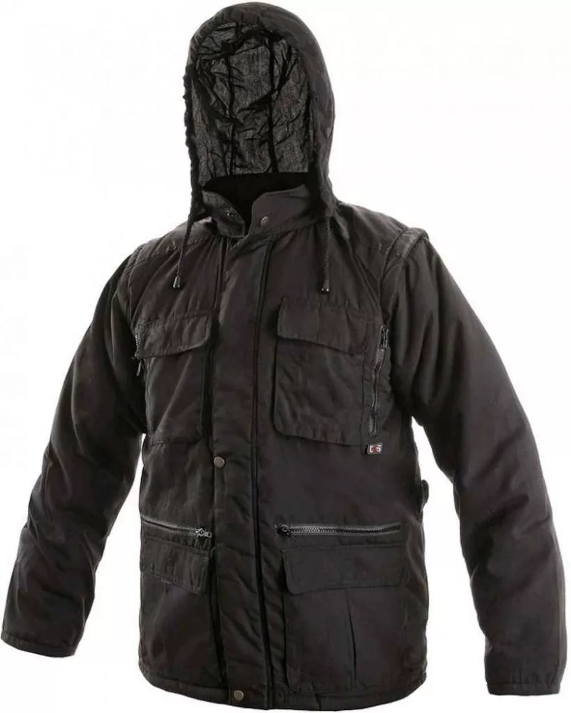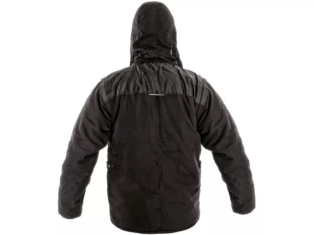 Kapucnis téli munkáskabát fekete színben, levehető kabátujjakkal, fényvisszaverő elemekkel.