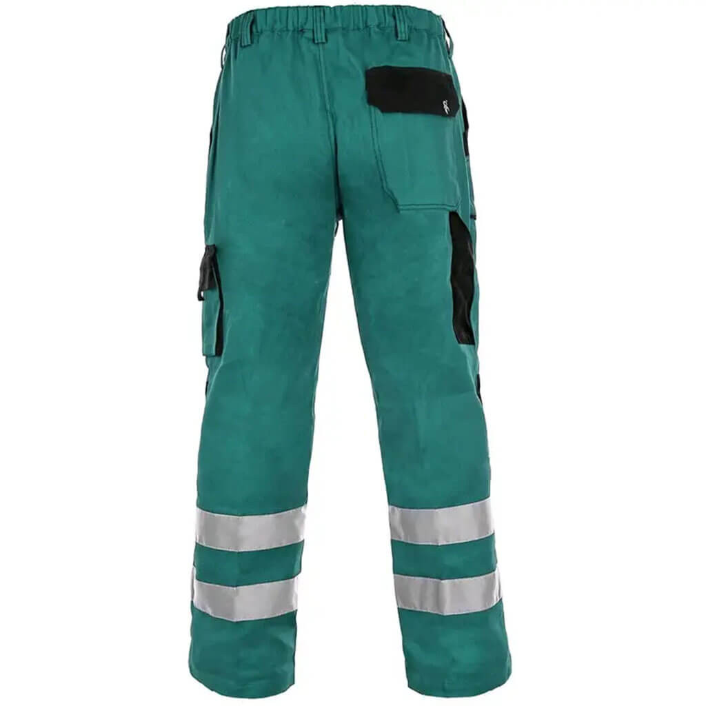 100% pamut anyagból készült láthatósági derekas munkásnadrág, széles fényvisszaverő csíkokkal, gumírozott derékkal.