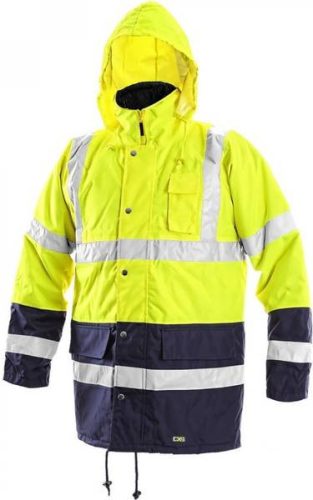 Kontrasztos színösszeállítású láthatósági télikabát, széles fényvisszaverő csíkokkal. A kabát anyaga és gallérba rejthető kapucnija is víz és szélálló.