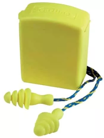EARLINE®   30213 • többször használatos, mosható, zsinóros sárga füldugó, rugalmas elasztomer anyagból • légréssel ellátott, szeletelt kúp alak, 4 lamella a jobb illeszkedés és a nagyobb védelem érdekében • minden pár külön, övre is tehető, higiénikus tartódobozban • SNR: 26 dB • csomagolás: 100/1 EU szabvány: EN352-2 SNR: 26dB