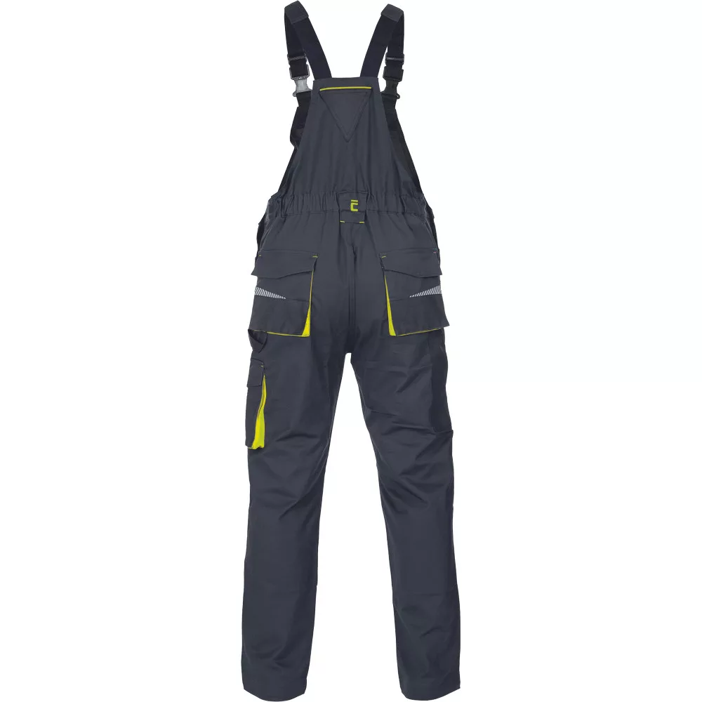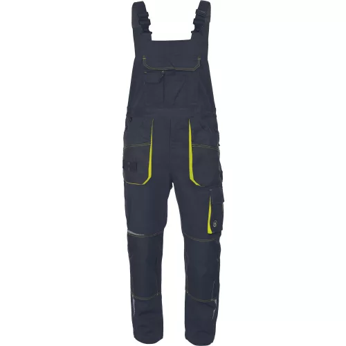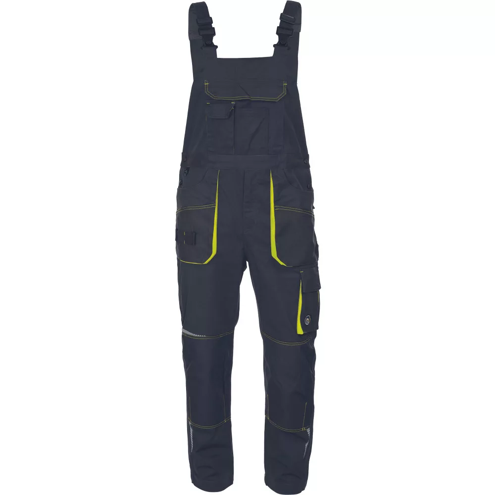 Praktikus kialakítású kantáros nadrág, nagy méretű zsebekkel, divatos fényvisszaverő csíkokkal rendelkezik.