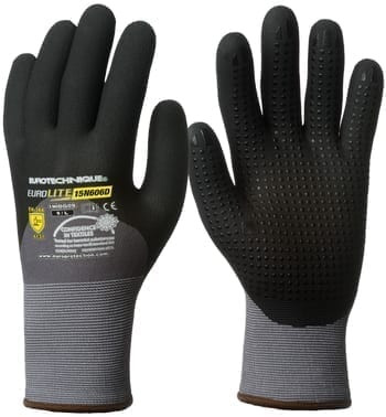EUROLITE • 15-ös kötésű, erős szakítás- és kopásállóságú szürke nylon / spandex • ökölcsontig fekete szellőző mikrohabosított nitrillel mártott, tenyerén csúszásbiztos pettyekkel • szellőző kézhát, gumírozott mandzsetta • könnyű, kiemelten komfortos, teljesen kézre simuló formai kialakítás, tenyerén és a kézháton is biztosított szellőzéssel • Öko-Tex® minősítés • széles méretszortiment • MÉRET: 6, 7, 8, 9, 10 és 11-es • CSOMAGOLÁS: 100/10 – páranként külön csomagolva EU szabvány: EN420, EN388: 4131