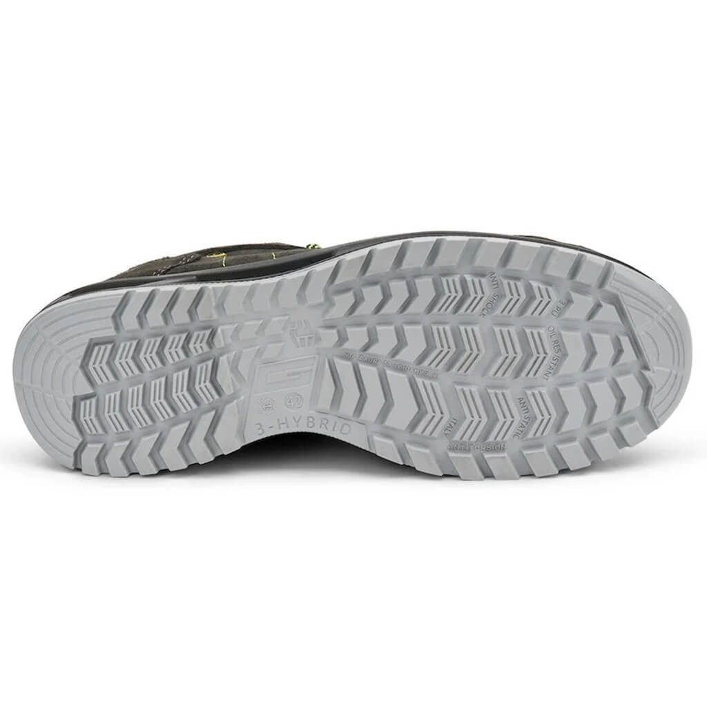 3HYBRID háromrétegű poliuretán talpszerkezettel készül, amely antisztatikus, hidrolízisálló (ISO 5423:92), olaj- és kopásálló, ütéscsillapító (anti-shock), csúszásbiztos kialakítású (SR).