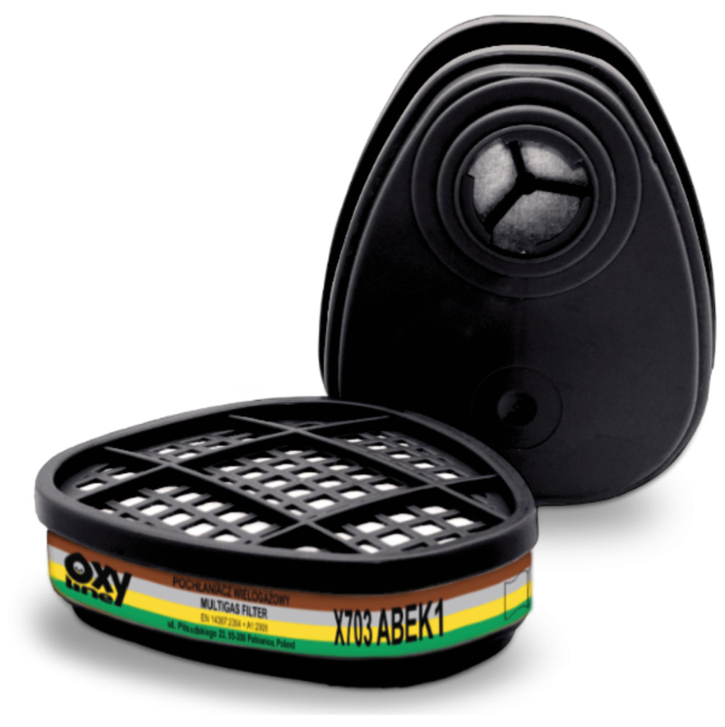 Az OXYLINE OXYPRO X703 ABEK1 kombinált szűrő betét, amely többféle veszélyes anyag elleni védelmet nyújtó szűrőmegoldás.