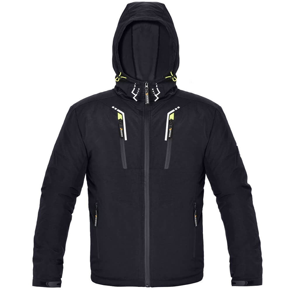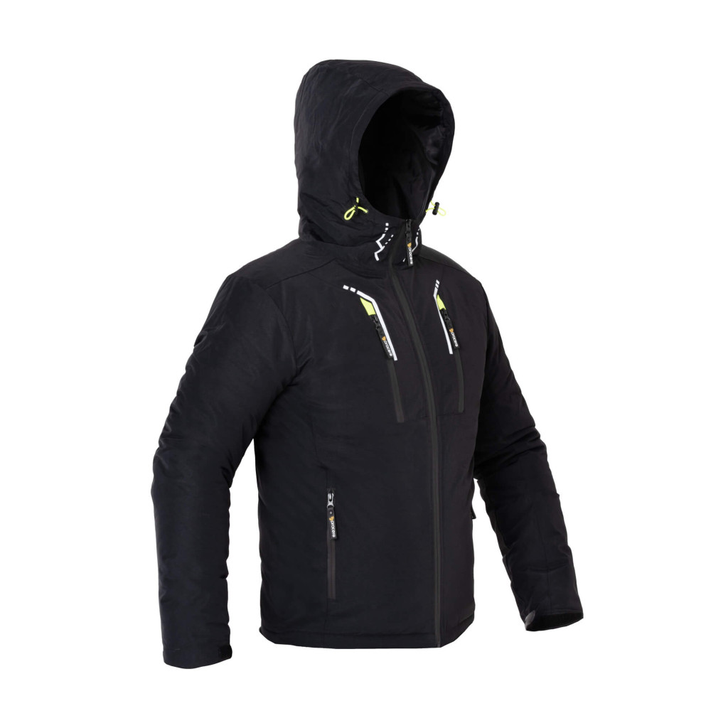Modern, szűkített szabású fekete színű procera luma téli munkakabát steppelt hőszigetelő béléssel.