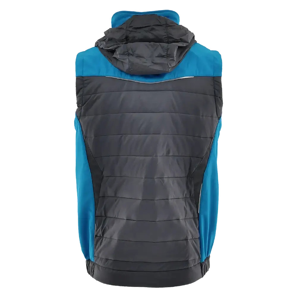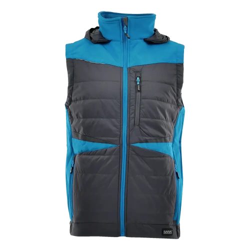 Praktikus kialakítású, modern szabású és megjelenésű bélelt munkás mellény, gallérba rejthető kapucnival.