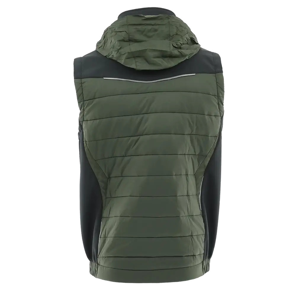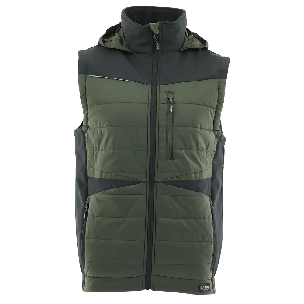 Praktikus kialakítású, modern szabású és megjelenésű bélelt munkás mellény, gallérba rejthető kapucnival.