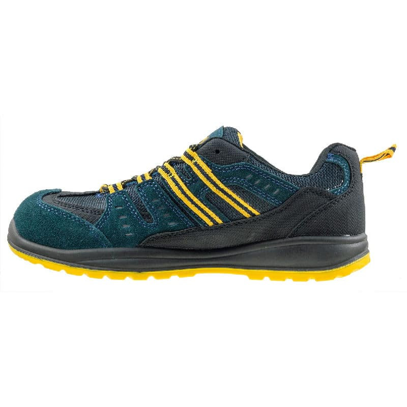 OB Védelmi szinttel ellátott munkavédelmi cipő Kapli nélküli kivitelben! A cipő felső része velúr és gyöngyvászon kombinálásából készült. A cipő talpa kopás és csúszásmentes, olajálló gumi anyagból készült. Divatos, sportos kivitel fekete/sárga színkombinációban, erősített sarokrésszel. Utcai viseletere és munkavégzésre is tökéletesen alkalmas!