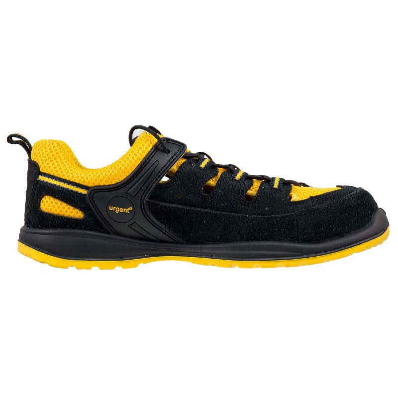 Urgent Lago 311 S1 Munkavédelmi Szandál Fekete/Sárga színű munkavédelmi szandál S1 védelmi szinttel. Acél kapli található az orrában, amely ellenáll 200J ütközésnek és 15kN nyomásnak. Energia elnyelő zárt sarokrész, antisztatikus talppal. A szandál nyelve lélegző hálós textil anyagból, a többi része pedig nubukbőrből készült. Gumis fűzőrendszerrel. Talpa dupla sűrűségű olajálló poliuretán anyagból készült.
