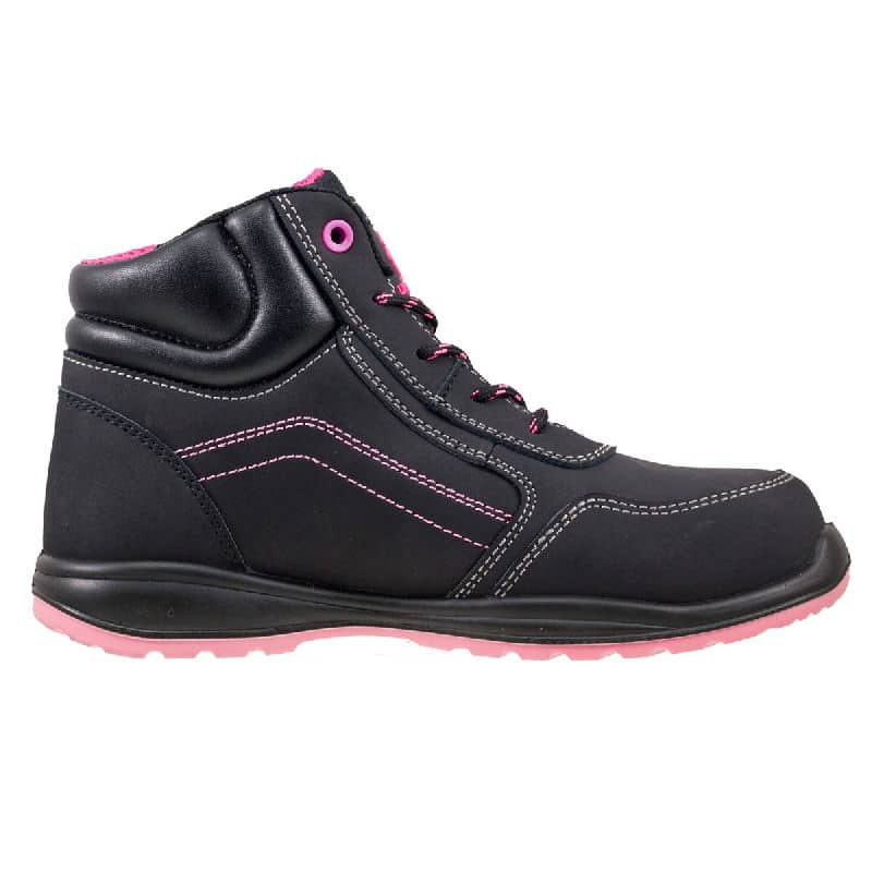 Női munkavédelmi bakancs S1 védelmi szinttel, amely tartalmazza az acél kaplit az orrában. Teteje kiváló minőségű nubuk bőrből készült.